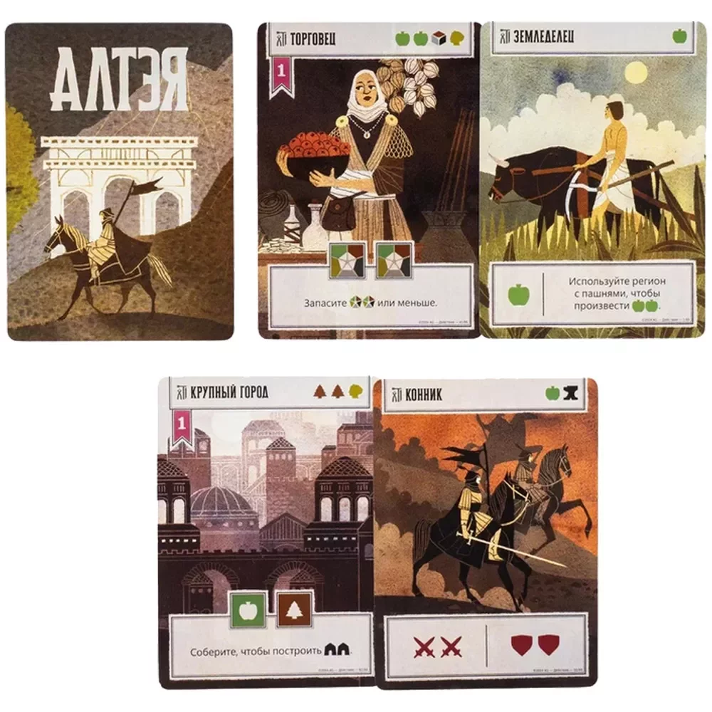 Ключевая механика Алтэи — колодострой. В начале у каждого игрока простая стартовая колода, но со временем вы покупаете новые карты на общем рынке, усиливая свой движок. Карты дают ресурсы (дерево, камень, еду, металл, культуру), военную силу, дополнительные действия и эффекты, влияющие на битвы, развитие и экономику. Важно не только брать сильные карты, но и следить за «мусором» в колоде: лишние, слабо взаимодействующие карты снижают эффективность и мешают выстроить стройную стратегию.