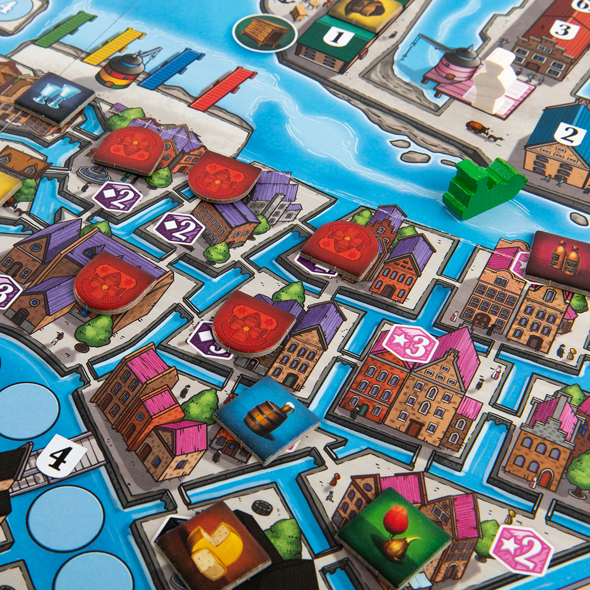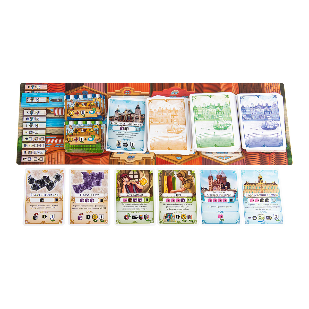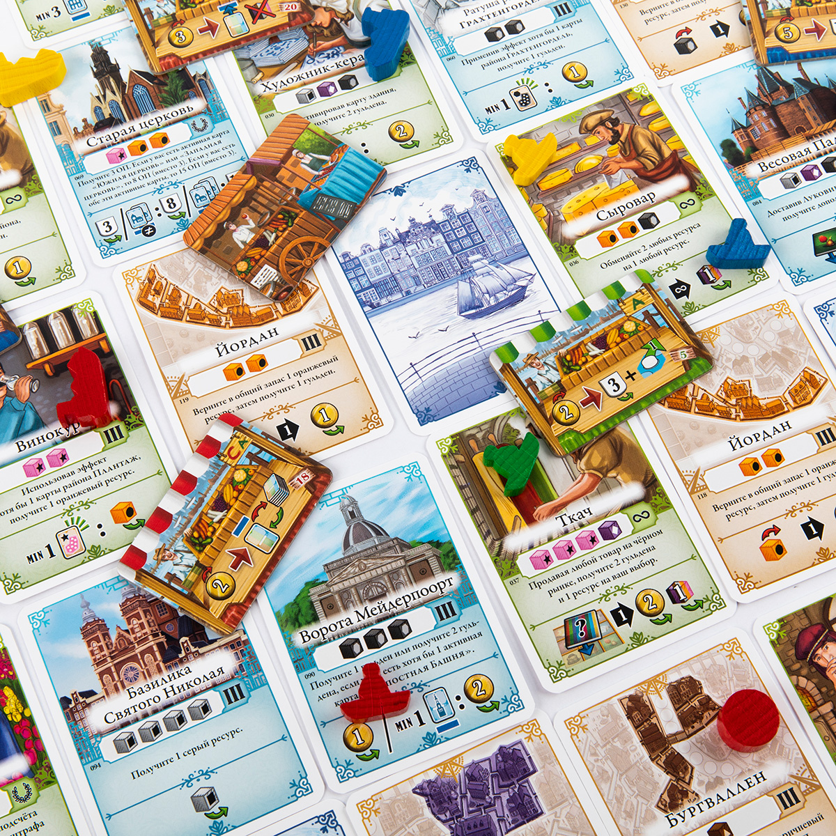 На большом общем поле представлены районы Амстердама, склады, пакгаузы и треки, по которым продвигаются ваши жетоны. Захват районов и контроль определённых зон на карте дают дополнительные очки, а также усиливают эффекты ваших карт профессий и зданий. В верхней части поля отмечается развитие по различным направлениям, а в нижней вы управляете личной областью карт, ронделем и ресурсами, строя многослойную стратегию.​