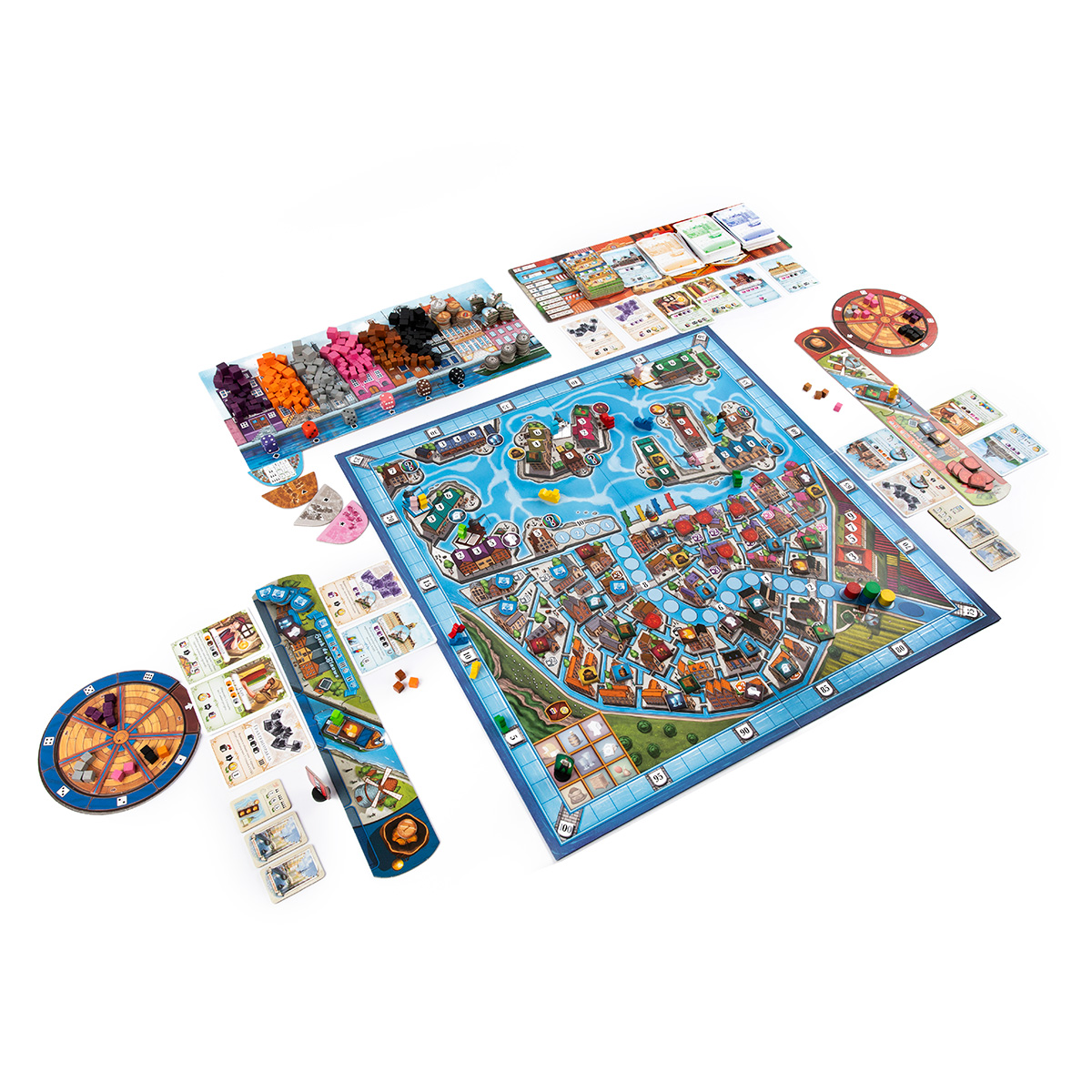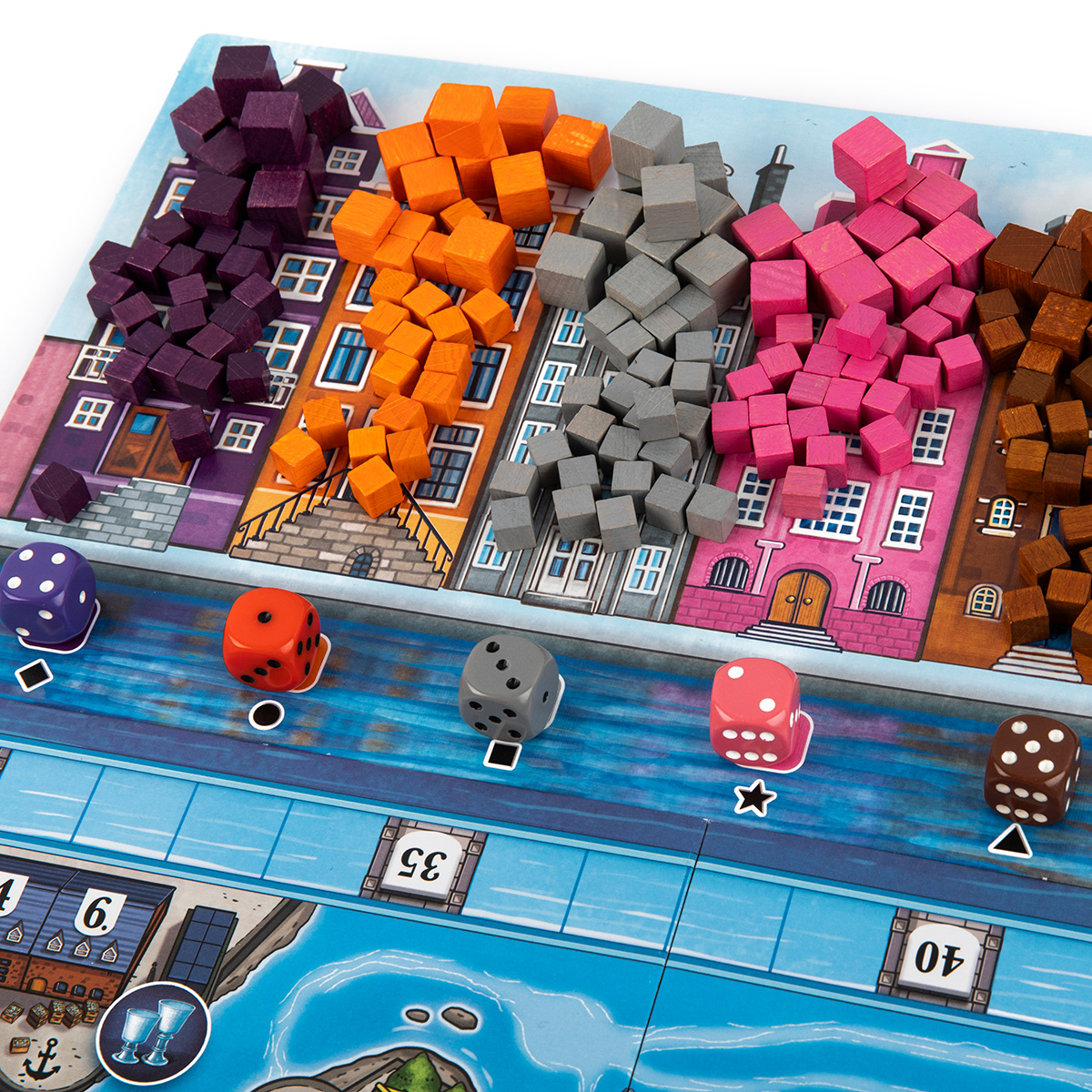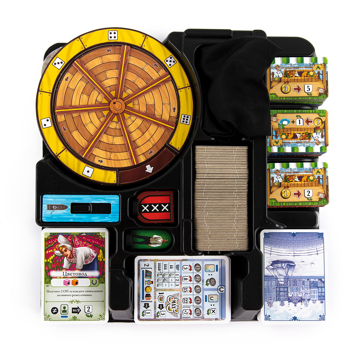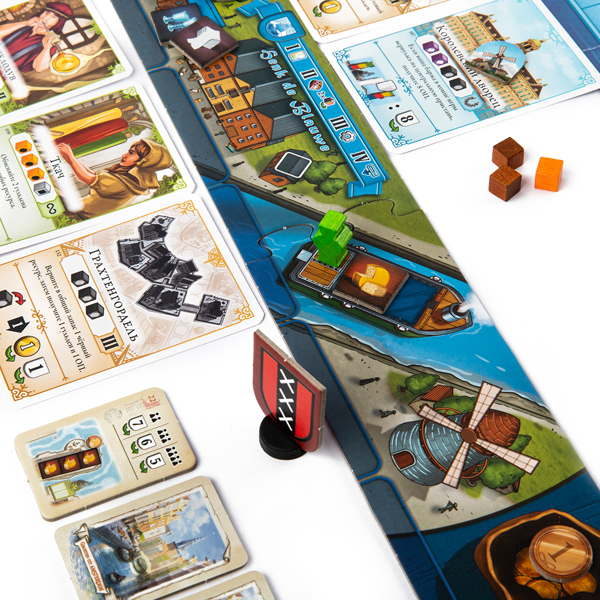 На большом общем поле представлены районы Амстердама, склады, пакгаузы и треки, по которым продвигаются ваши жетоны. Захват районов и контроль определённых зон на карте дают дополнительные очки, а также усиливают эффекты ваших карт профессий и зданий. В верхней части поля отмечается развитие по различным направлениям, а в нижней вы управляете личной областью карт, ронделем и ресурсами, строя многослойную стратегию.​