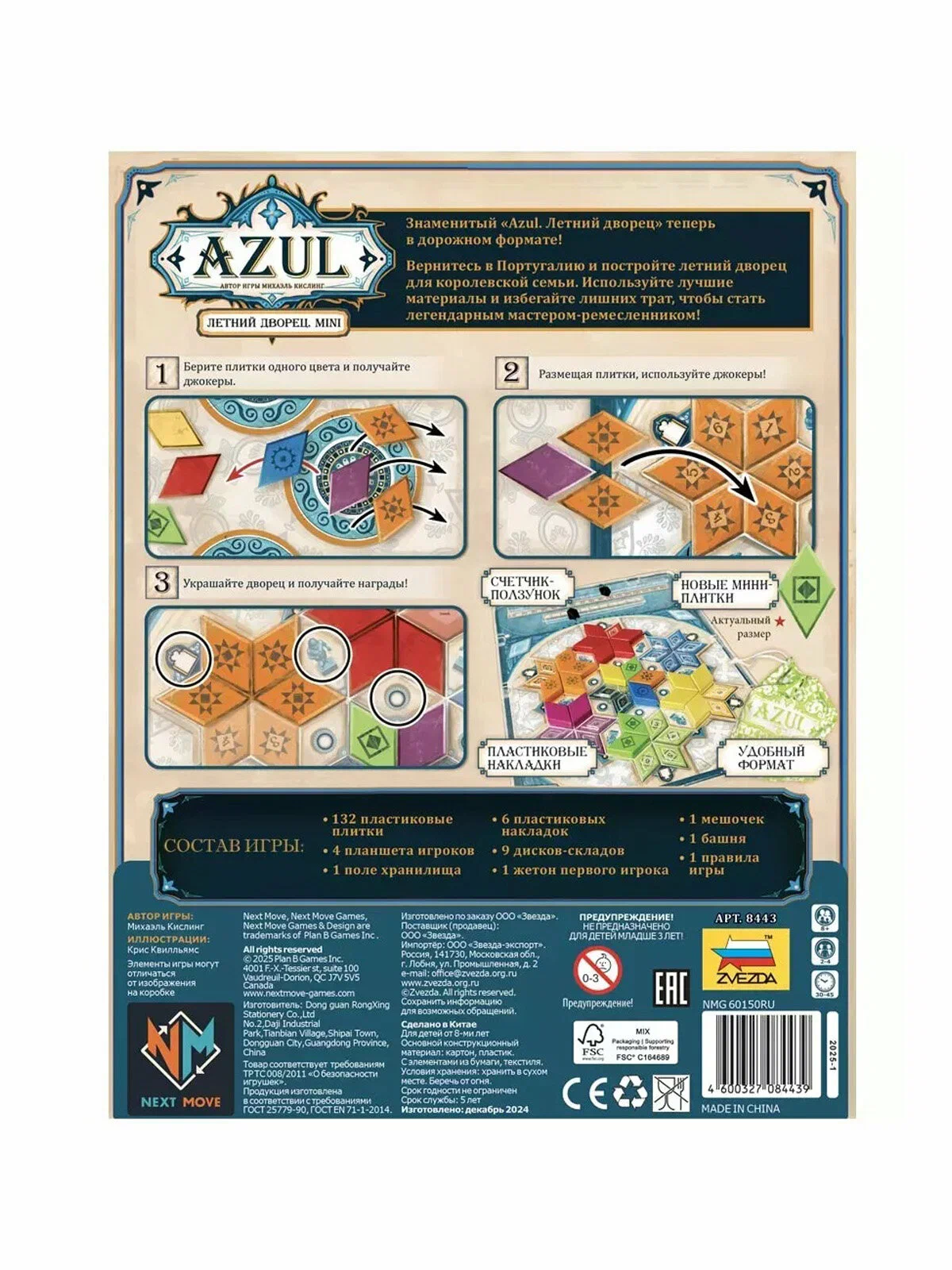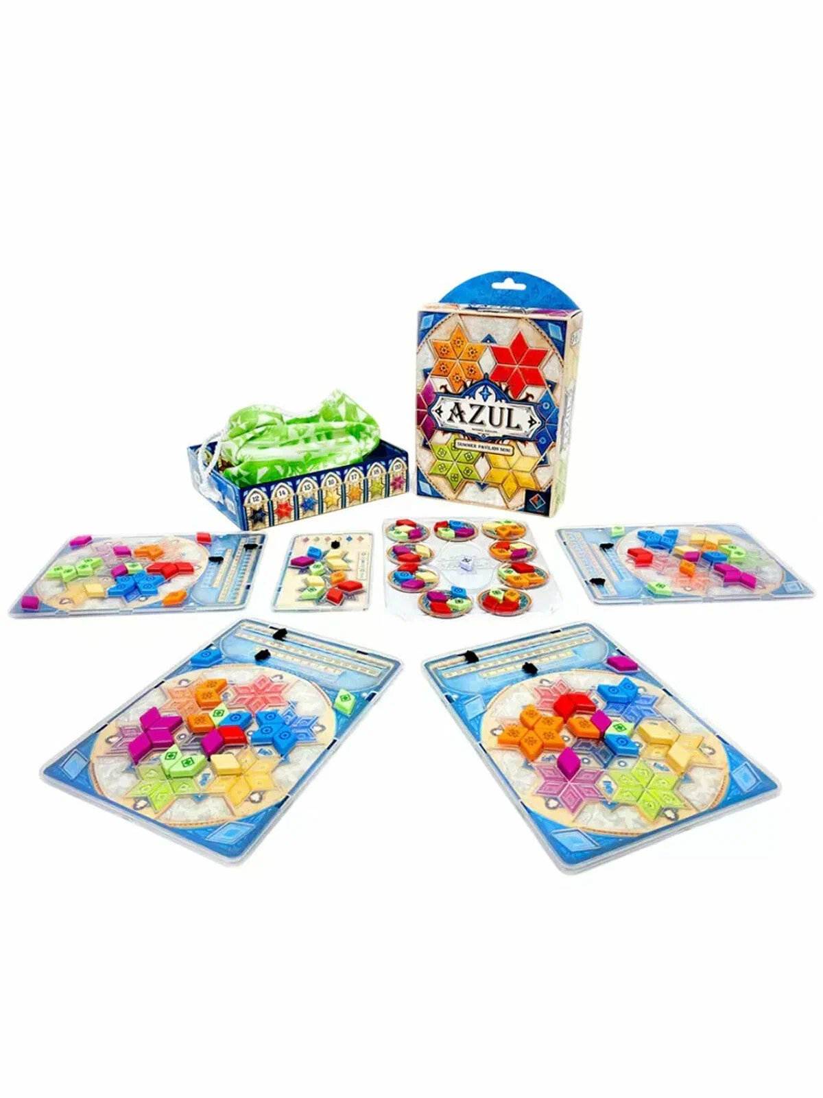Мини‑издание также привлекательно для тех, кто уже знаком с серией Azul и хочет иметь версию «на выезд», не занимая много места на полке и в багаже. При этом компоненты здесь остаются полноценными: в международном издании указано, что в коробке лежит более сотни плиток, несколько пластиковых лотков‑органайзеров и тканевый мешочек для удобного набора компонентов. Визуальный стиль полностью повторяет оригинальный «Летний дворец»: яркие цвета, изящные узоры и узнаваемый фирменный дизайн.