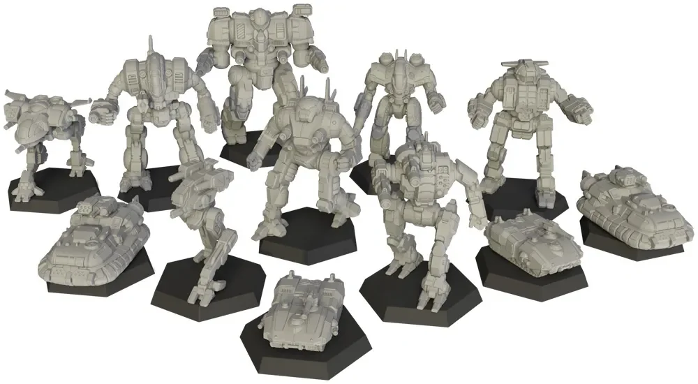 12 высококачественных, полностью собранных (неокрашенных) миниатюр: 8 мехов и 4 боевые машины.