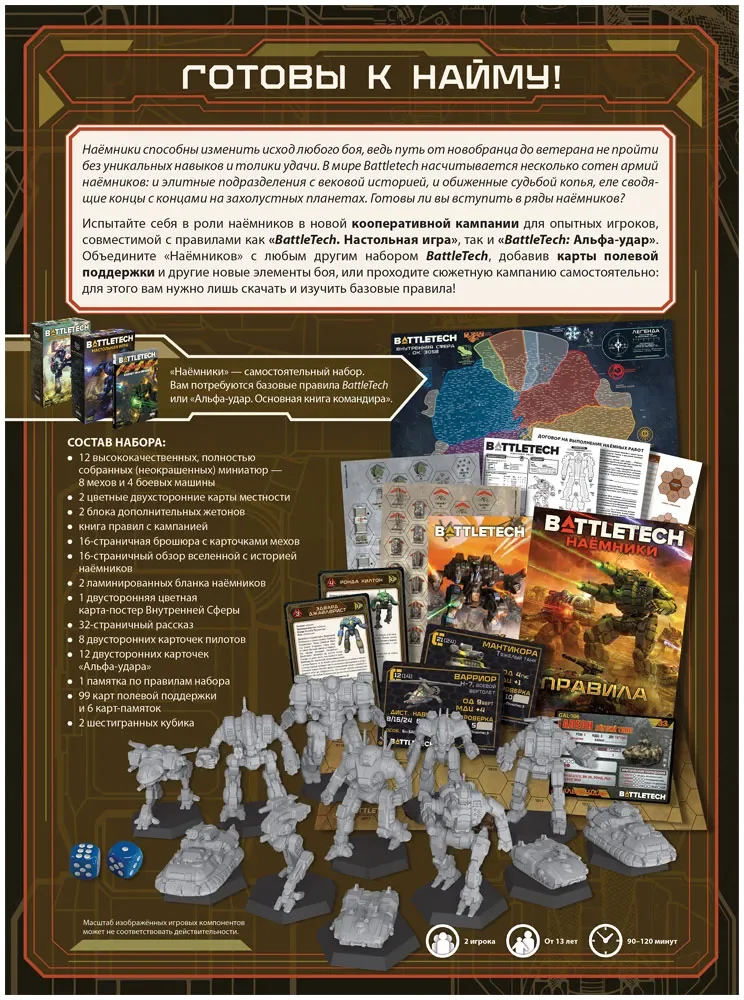 BattleTech: Наёмники рассчитаны на 2 игроков, партии длятся в среднем от 90 до 120 минут и подходят для возрастной категории 13+. Это дополнение, а не самостоятельная игра: для использования набора нужны базовые правила «BattleTech: Настольная игра» или «BattleTech: Альфа‑удар. Основная книга командира». Если вы хотите получить готовую кампанию, расширить коллекцию миниатюр и добавить в свои сражения наёмный колорит, эта коробка станет мощным и содержательным пополнением вашей армии.