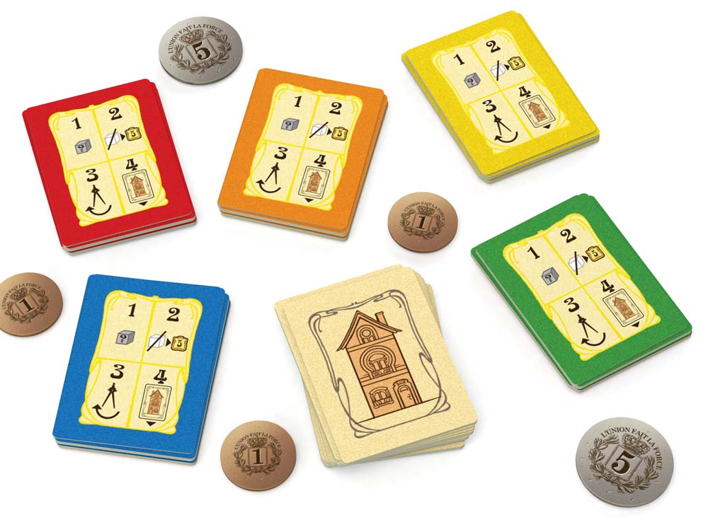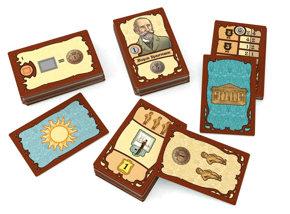 Компоненты подчёркивают художественную тему. В коробке два двухсторонних игровых поля, составное двухстороннее поле, 5 планшетов игроков, 106 карт, жетоны зданий и произведений искусства, жетоны «Прекрасной эпохи», монеты и множество деревянных и пластиковых элементов, отвечающих за ресурсы, рабочих и маркеры. Иллюстрации и оформление помогают погрузиться в атмосферу Брюсселя конца XIX века, где каждый дом – потенциальный шедевр.