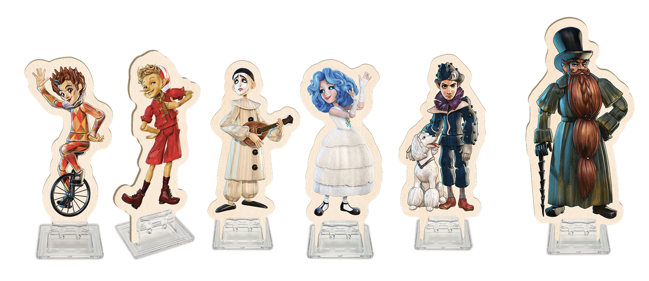 Компоненты игры оформлены в ярком сказочном стиле, который сразу отсылает к классическому «Буратино». В коробке есть крупное красочное игровое поле, сборная театральная сцена, шесть фишек персонажей с подставками и набор жетонов монет. Все элементы рассчитаны на детские руки: их удобно брать, переставлять и рассматривать во время партии.​