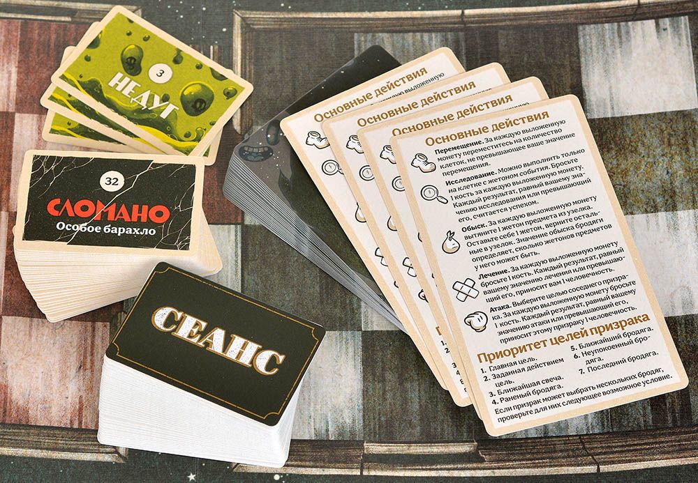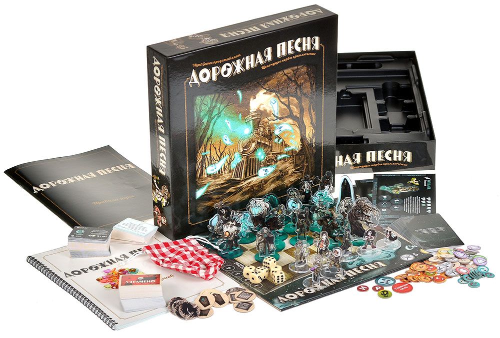 Сюжет гипнотический: гудок в ночи, синий свет, долгий сон в вагоне. Книга сценариев ведёт через приключения: от первых призраков до кульминации. Двигайтесь по полю поезда, бросайте 6 кубиков d6 на действия, используйте карты для снаряжения и способностей. 7 фигурок бродяг с подставками против 20 призраков — позиционирование решает исход.​