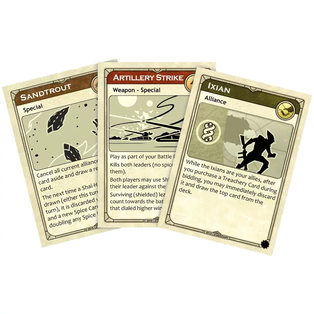 Кроме фракций, дополнение вводит новые карты предательства, предсказаний и уловок. Карты предателей расширяют возможности по подкупу лидеров и неожиданным переворотам в битвах. Карты предсказаний усиливают фракции с долгосрочными планами, вроде Бене Гессерит, и создают дополнительные условия для альтернативных побед. Новые карты уловок добавляют тактические опции, позволяя вмешиваться в экономику, бои и взаимодействие фракций.
