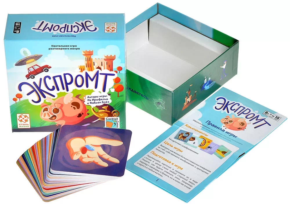 Компактная квадратная коробка и всего одна колода карт делают игру мобильной – её удобно брать с собой в поездку, на дачу или в гости. А универсальный формат без сложных компонентов позволяет разложить «Экспромт» практически где угодно: нужна только поверхность для карт и немного воображения.