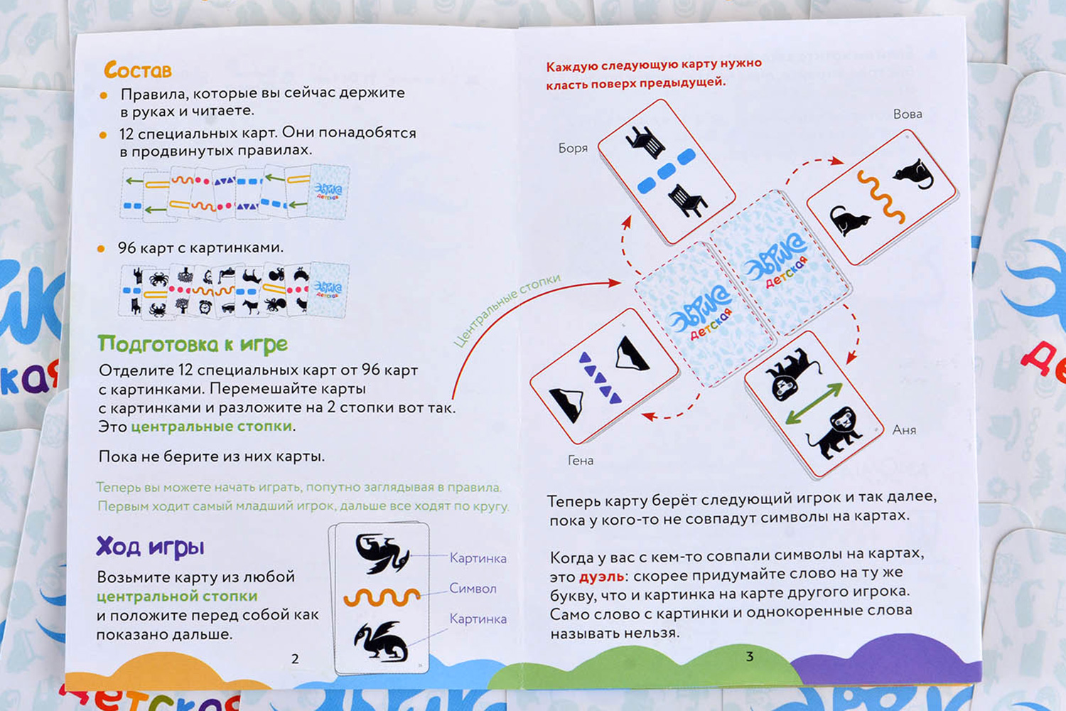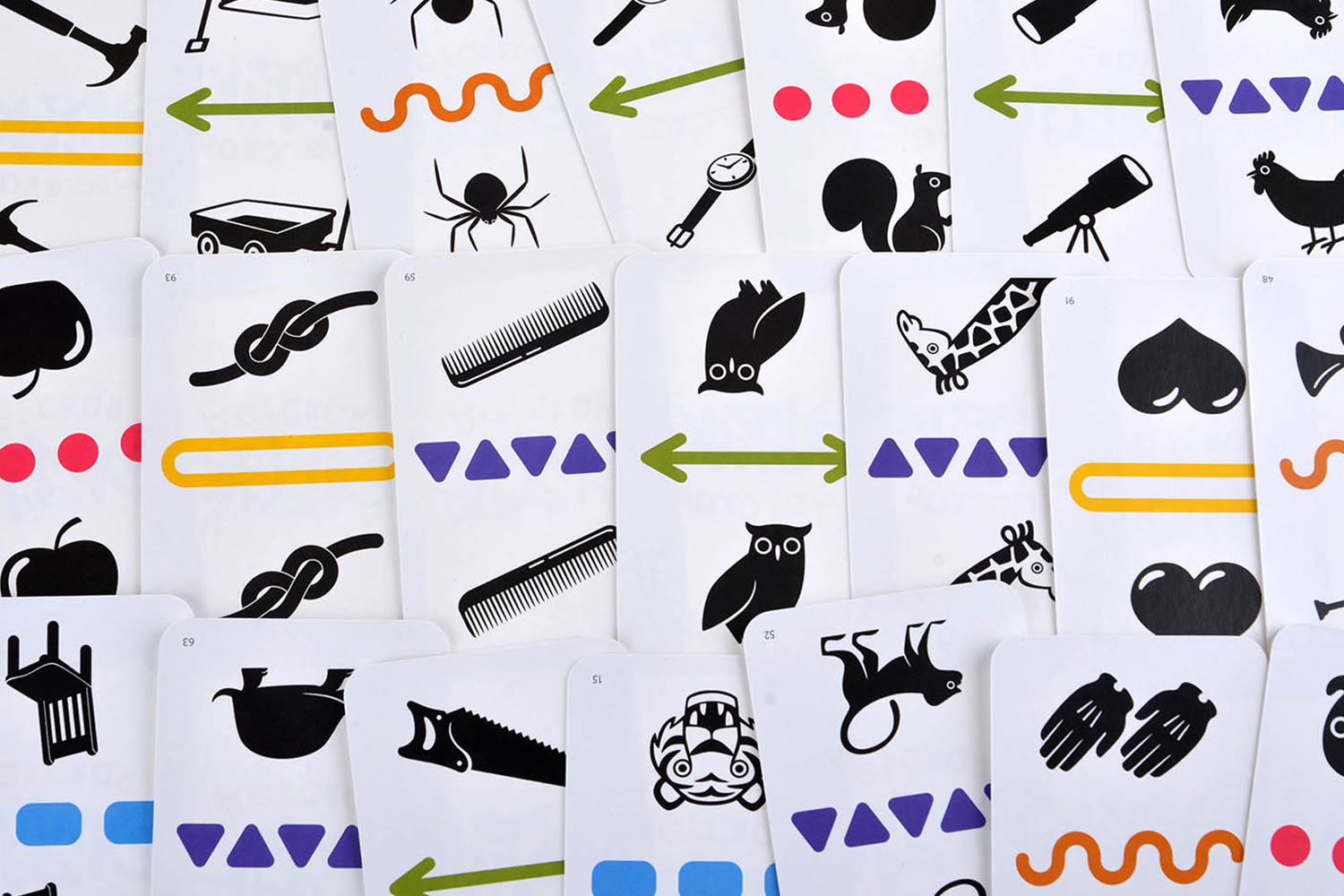 Тяните по очереди карты и кладите перед собой. Если у вас с кем-то совпали символы, придумайте первым слово на ту же букву, что и картинка на чужой карте. Получилось? Забирайте себе его карту, игра продолжается. Когда колода закончится, побеждает тот, кто набрал больше всех карт.