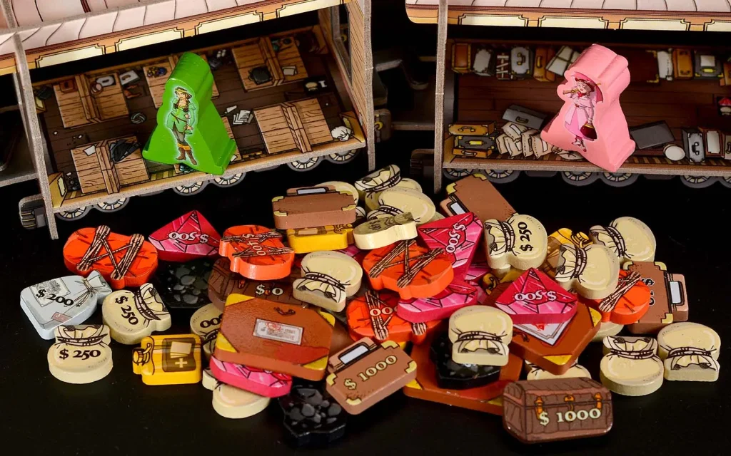 Особое внимание уделено улучшенным компонентам. Юбилейное издание включает детализированные 3D‑вагоны и локомотив, специальные элементы ландшафта, деревянные фишки бандитов, шерифа и добычи, а также качественные карты и планшеты. Обновлённые деревянные жетоны добычи и фигурки делают поезд не только функциональным, но и зрелищным – игра эффектно смотрится на столе и отлично подходит в качестве подарка.