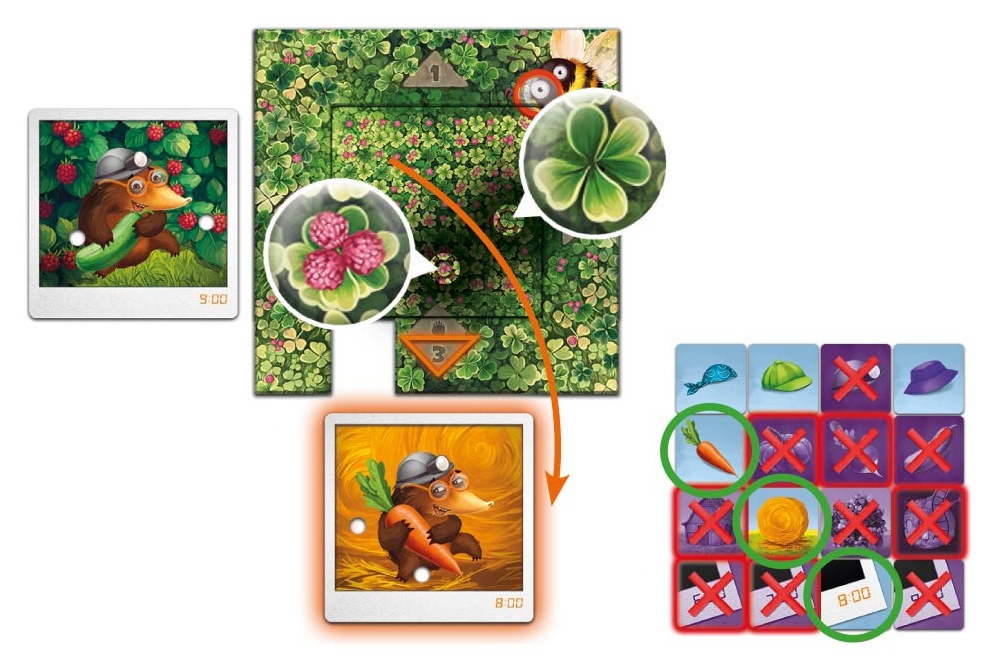 Сюжет разворачивается на солнечном огороде. Кроты прячут урожай в норах, и вам нужно выяснить: какой именно крот виноват, когда он украл, с каким овощем и в какую нору. Каждая партия — новое дело: секретная карта под планшетом хранит правду, а вы методом исключения сужаете круг подозреваемых.