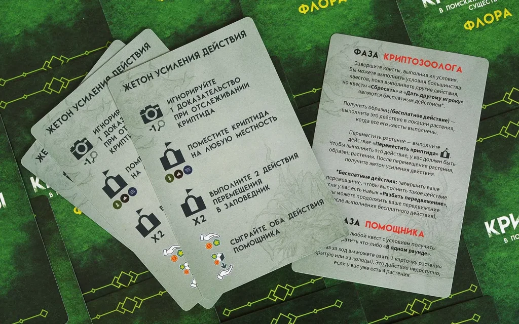 Дополнение вводит в игру новый пласт задач – карты растений и квесты, связанные с ними. Каждый экземпляр мифической флоры – это отдельная карта с описанием и специальным заданием, которое нужно выполнить, чтобы заполучить растение и его эффект. Темы квестов привязаны к уже знакомым механикам базы: вам могут понадобиться определённые типы доказательств, успехи в отслеживании криптидов, нужное расположение тайлов в заповеднике или выполнение конкретных контрактов. Таким образом, «Флора» аккуратно вплетается в существующую структуру партии, не ломая её, а добавляя новые цели и приоритеты.