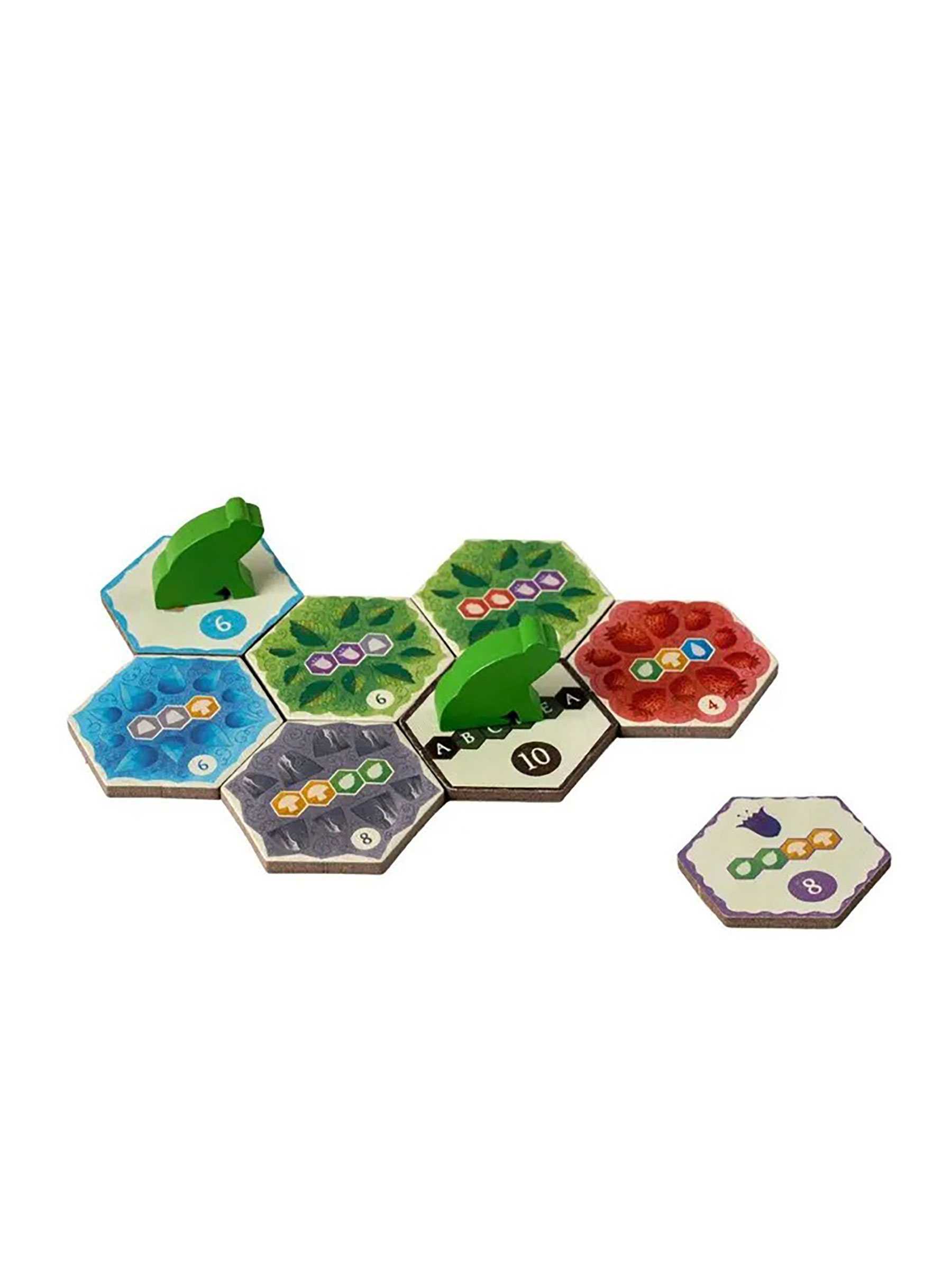 В сказочном лесу живут духи-зайцы, олени, птицы и лягушки — именно их фигурками вы будете путешествовать по своим полянкам. В начале партии у каждого участника есть стартовый тайл и набор фигурок животных, а остальные тайлы отправляются в мешочек. На столе формируется рынок из шести шестиугольных плиток, и ход игрока сводится к тому, чтобы взять подходящий тайл и присоединить его к своему лесу, постепенно создавая узор из троп, ресурсов и заданий.