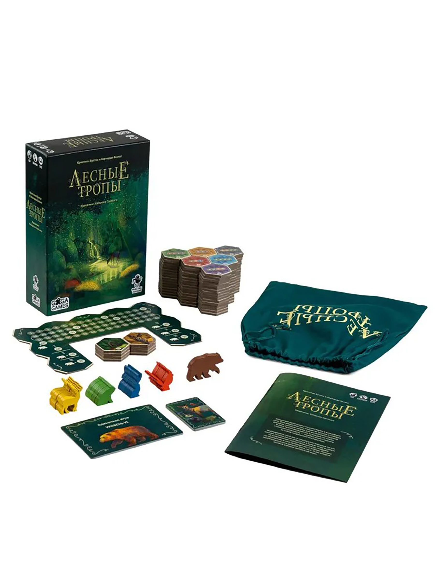 Компоненты выполнены очень качественно: плотные шестиугольные тайлы выдержат множество партий, а объёмные деревянные фигурки животных приятно смотреть и передвигать по полю. Акварельные иллюстрации создают ощущение сказочного леса — прогулка по тропинкам визуально не менее привлекательна, чем сама механика. Игра подходит для тихого семейного вечера, серьёзного соревнования за очки или расслабленного «пасьянса» в одиночку — она гибко подстраивается под настроение и компанию.