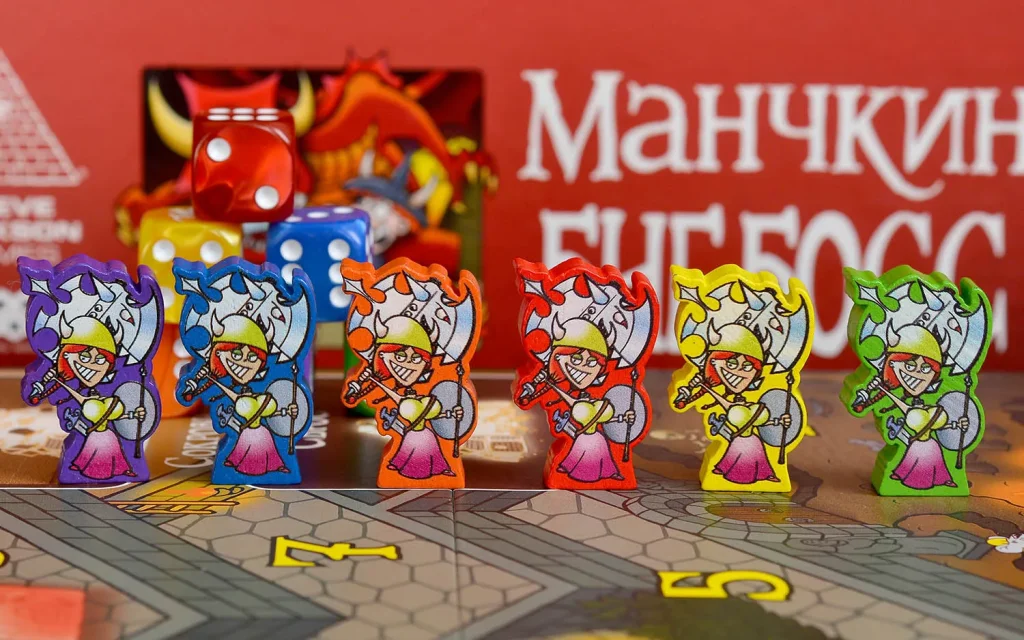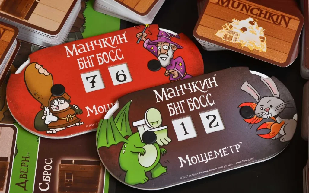 Отдельный пласт удовольствия – это мерч и «физические» бонусы. В коробке вы найдёте 12 деревянных фигурок, которыми можно заменить стандартные жетоны или использовать как миниатюры для отслеживания кампаний. Два мощеметра помогают удобно считать боевую силу во время драки, чтобы все видели, кто сейчас главный монстроборец за столом. В набор также входят 6 кубиков, эмалированный значок со Спайком, стикерпак с персонажами и пять уникальных книжных промо‑закладок для самых преданных манчкинов.