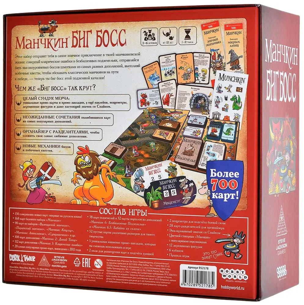 «Манчкин: Биг Босс» – это не отдельная игра, а огромный подарочный набор для всех поклонников Манчкина. Внутри вы найдёте сотни карт, новые механики и целый сундук тематического мерча, который превращает обычную партию в Манчкина в эпическое приключение с боссами, квестами и кучей зрелищного лута. Набор рассчитан на 3–6 игроков от 12 лет и подходит как для тех, кто только начинает знакомство с Манчкином, так и для закоренелых манчкинов, у которых уже накопилось много дополнительных наборов.