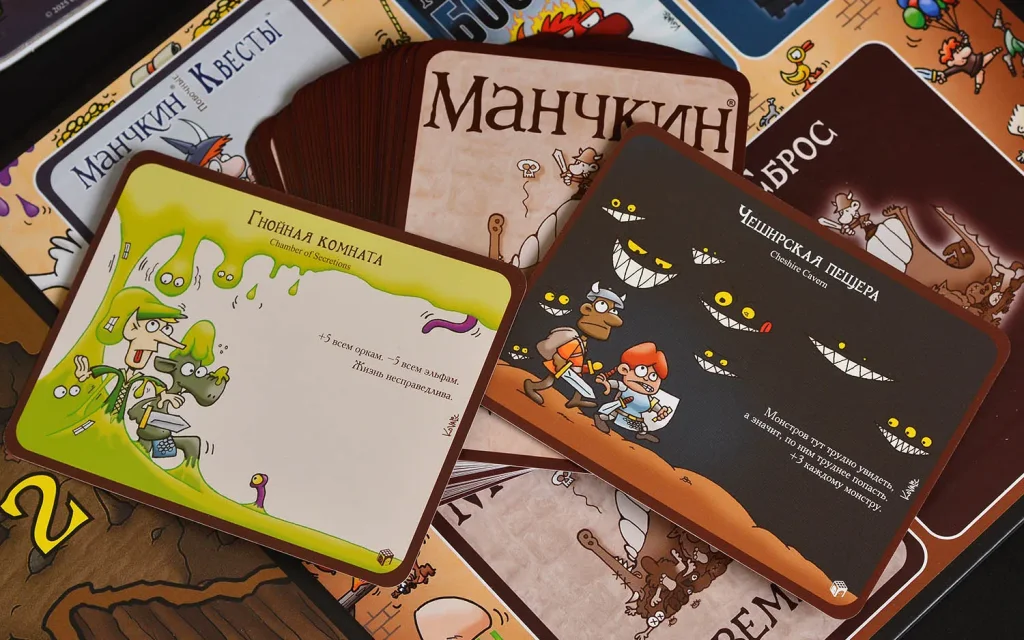 Помимо карт, «Манчкин: Биг Босс» добавляет новые механики – могучих боссов и побочные квесты. Боссы – это особо опасные противники, на которых мало просто «накидать бонусов»: к ним нужно готовиться, подбирать экипировку и иногда даже временно договариваться с другими игроками. Побочные квесты дают дополнительные цели помимо гонки за десятым уровнем: выполняйте особые задания, чтобы обогнать соперников, выжать ещё больше профита из каждого столкновения и почувствовать себя настоящим хозяином подземелья.