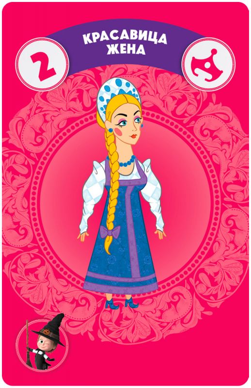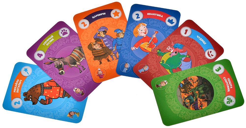Карты сказок: 112 шт., 56 × 87 мм – персонажи, роли и элементы сюжета с цифрами, влияющими на «вес» сказки и ограничение суммы до 10.