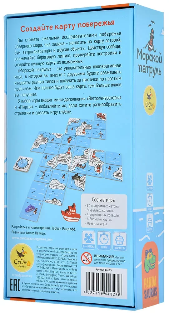 «Морской патруль» рассчитан на 1–4 игроков и отлично подходит как для соло‑прохождений, так и для семейных партий. Партия занимает около 30 минут, а низкий порог входа делает игру понятной для новичков, при этом продуманное пространственное мышление и кооперативное планирование могут заинтересовать и опытных игроков. Это спокойная, но напряжённая в достижении результата игра, где успех зависит не от удачи, а от слаженной работы команды и умения видеть карту наперёд.