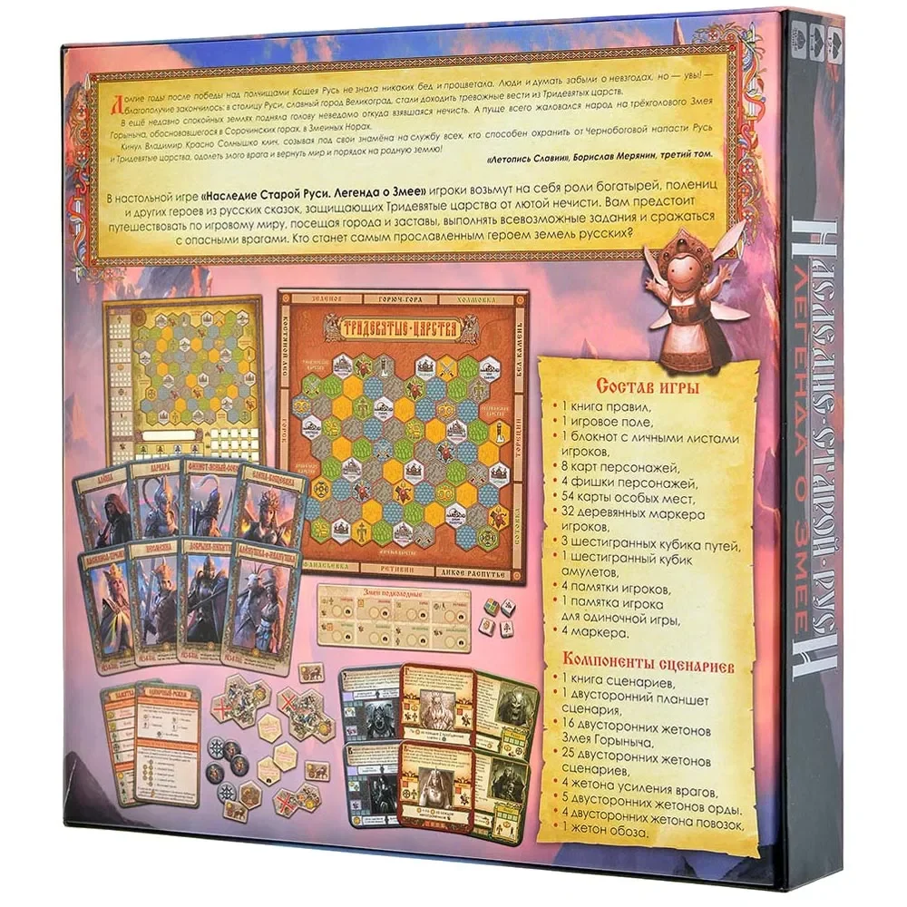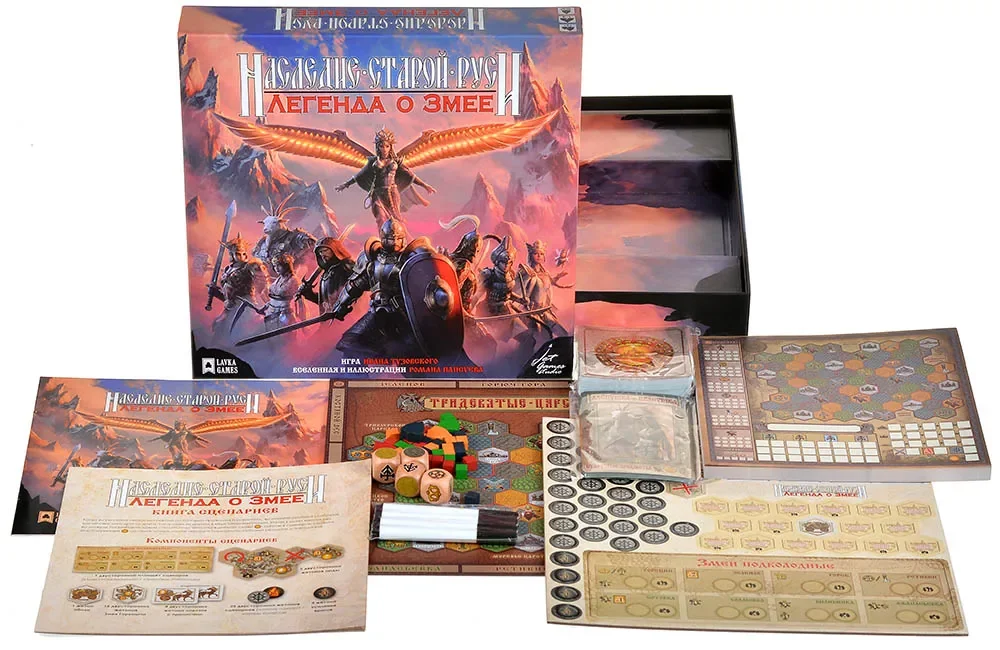 «Наследие Старой Руси. Легенда о Змее» — приключенческая настольная игра в жанре roll&write, переносящая игроков в мир славянского фэнтези по мотивам вселенной «Сказки Старой Руси». Вы возьмёте на себя роли богатырей, отважных полениц и других героев, которые защищают юго‑восточные земли Славии у Сорочинских гор от нечисти и трёхголового Змея.