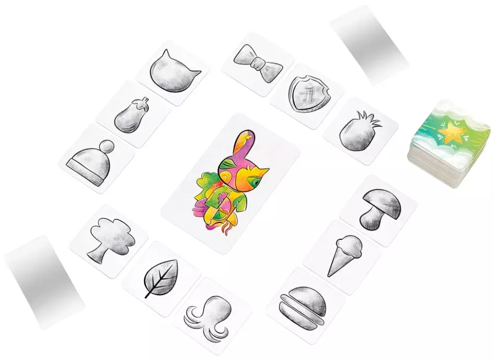 В начале партии на стол выкладываются большие карты с причудливыми узорами, а рядом — стопка маленьких карточек с предметами, которые нужно найти. Ход прост: открывается очередная маленькая карта, и все участники одновременно ищут этот объект на своих больших картах, прикладывая зеркало под разными углами. Как только кто‑то замечает, что «непонятная дуга» превратилась в баклажан, а странный завиток — в пальму, игрок показывает совпадение другим и забирает карточку себе.