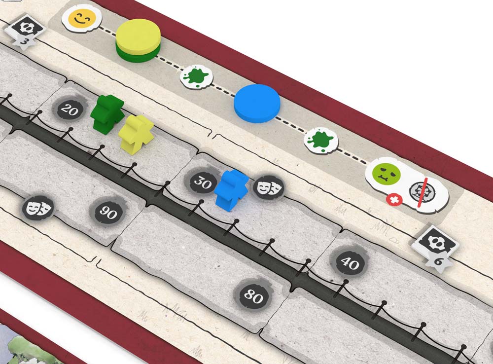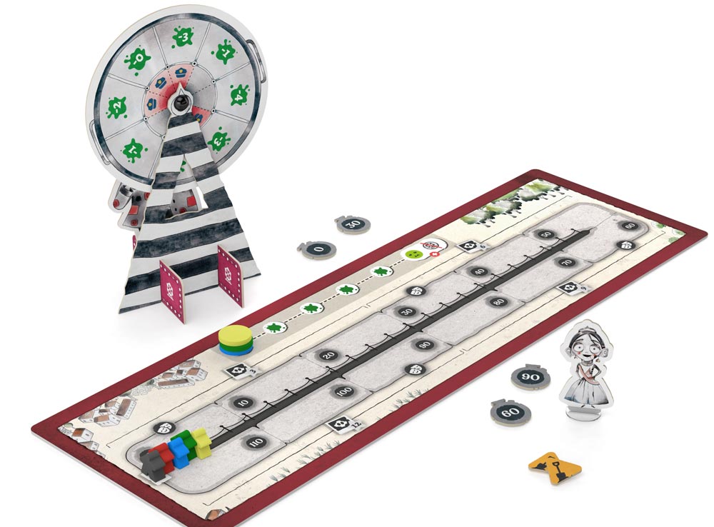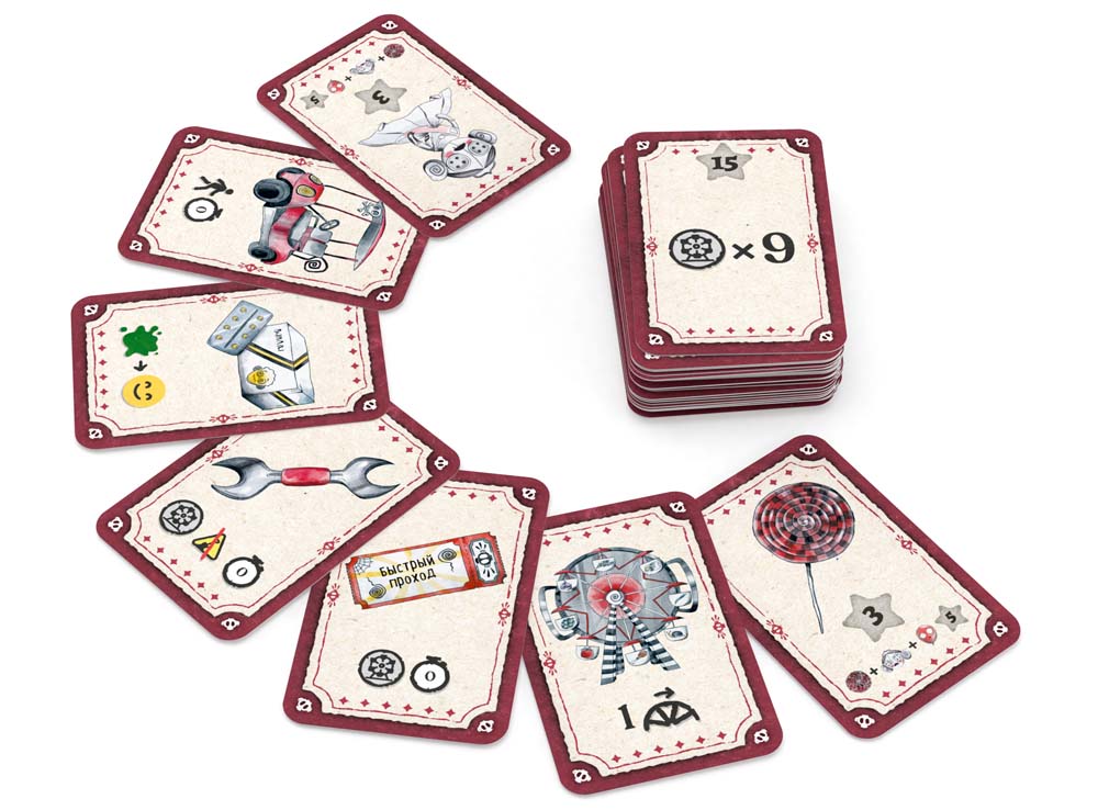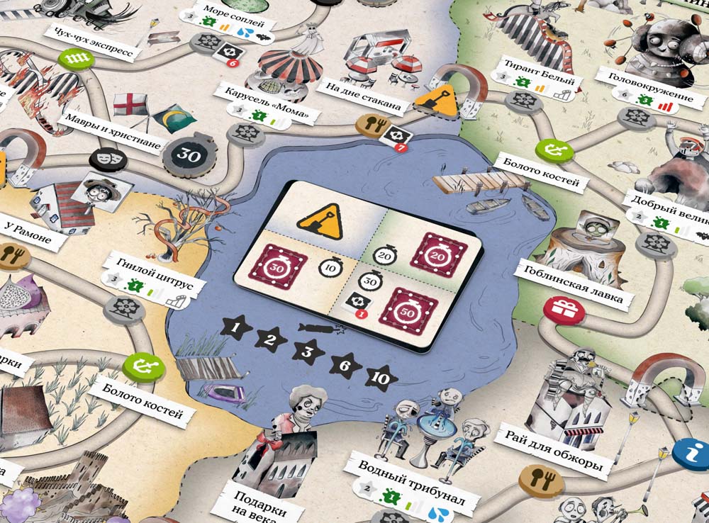 Ход тактический: выбирайте аттракционы, учитывайте время и очередь. Колесо паэлья крутится на заклёпке, фишки рвоты — за переедание, жетоны техобслуживания блокируют зоны. Подсчёт в блокноте: очки за миссии, фото, покупки. Победитель — с максимумом впечатлений.