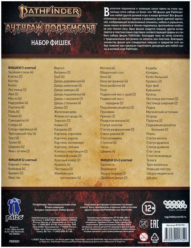 Воплотите подземелья и зловещие замки прямо на столе при помощи этого набора из более чем 100 фишек для Pathfinder или любой другой ролевой игры в жанре фэнтези! Все фишки отпечатаны на плотном картоне и украшены яркой цветной картинкой, изображающей всевозможные элементы, мебель и украшения, какие можно встретить в тёмном подземелье, фэнтезийном особняке или тёмном лесу. Одни фишки кладутся плашмя, другие вставляются в пластмассовые подставки соответствующей формы из любого набора фишек Pathfinder, благодаря чему их легко сочетать с традиционными фигурками из металла или пластика. Благодаря множеству фишек для стандартных ловушек и предметов этот набор фишек позволит вам идеально подготовить декорации для любой сцены в ролевой игре Pathfinder.