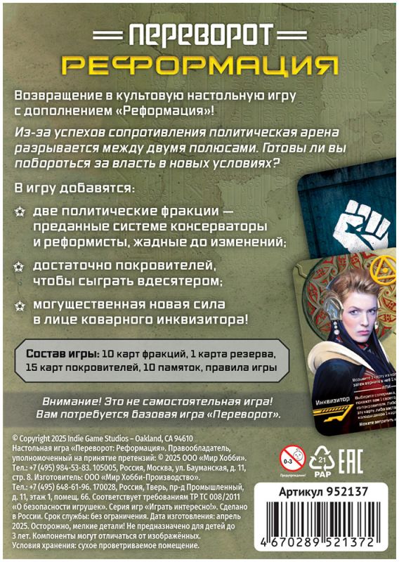 Важно: это не самостоятельная игра. Для использования дополнения требуется базовая версия «Переворот», в которой находятся основные карты персонажей, монеты, жетоны влияния и полный набор базовых ролей. «Реформация» расширяет уже знакомую колоду и добавляет новые режимы – в том числе возможность командной игры с фракциями при сохранении единоличного победителя.
