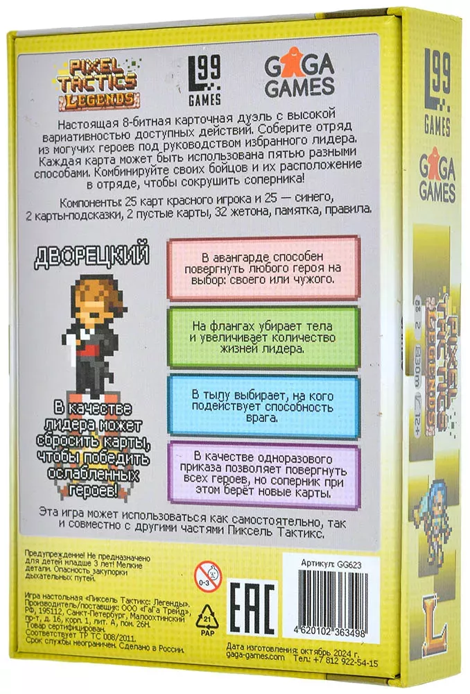 При этом по времени «Пиксель Тактикс: Легенды» остаётся довольно компактной. Средняя партия занимает около 30 минут, а за счёт симметричных колод и огромного количества лидеров (50 вариантов) реиграбельность очень высокая: каждая комбинация лидера и построение отряда ощущаются по‑новому. Коробка удобного небольшого формата, поэтому игру легко брать с собой и играть сериями дуэлей.