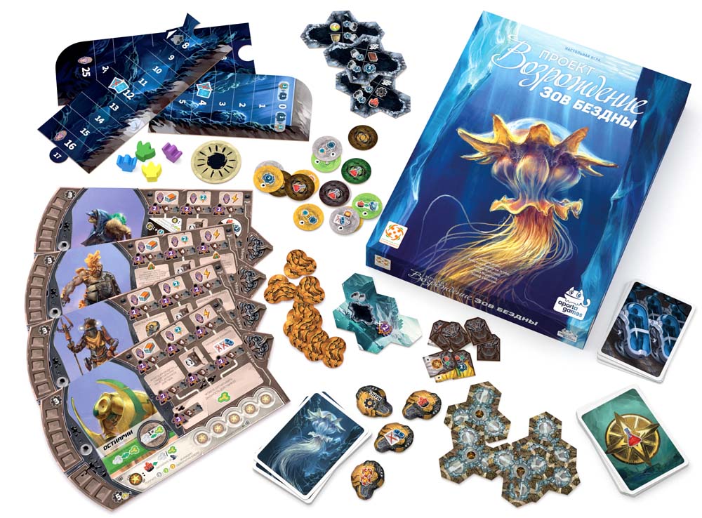 «Проект "Возрождение": Зов Бездны» — первое крупное дополнение к стратегической игре «Проект "Возрождение"», добавляющее 4 новых племени, экспедиции и механики водоёмов для насыщенных партий. Исследуйте бездну: стройте у озёр, собирайте карты медуз с уникальными способностями, отправляйтесь в путешествия за артефактами утерянного мира. Углубляет сюжетную кампанию из 5 частей, повышая сложность и разнообразие для 1–4 игроков от 14 лет, партии 90–120 минут.