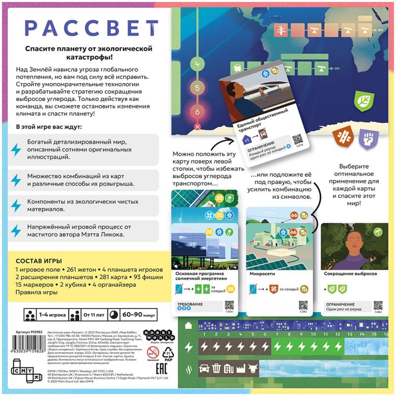 «Рассвет» — кооперативная стратегическая игра от Мэтта Ликока, создателя легендарной «Пандемии», в которой игроки объединяют усилия ведущих мировых держав, чтобы предотвратить климатическую катастрофу. Над Землёй нависла угроза глобального потепления, и только совместными действиями Китая, Европы, США или развивающихся стран можно разработать технологии, сократить выбросы углерода и справиться с кризисами вроде штормов, засух и инфраструктурных сбоев.