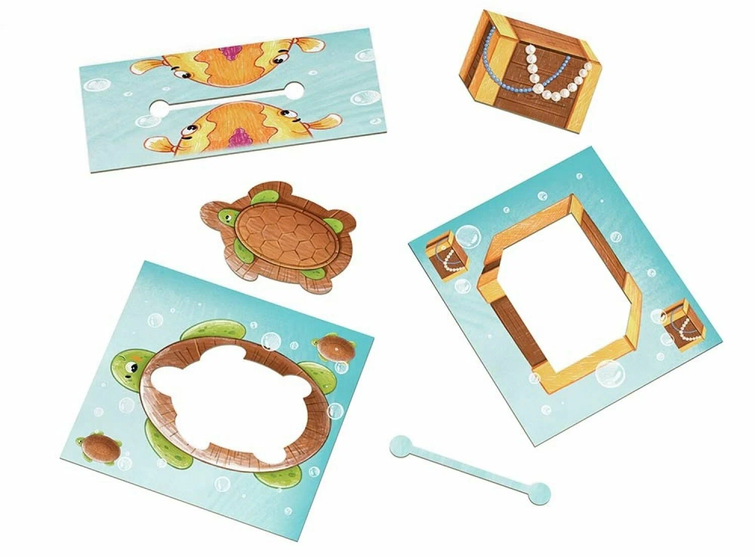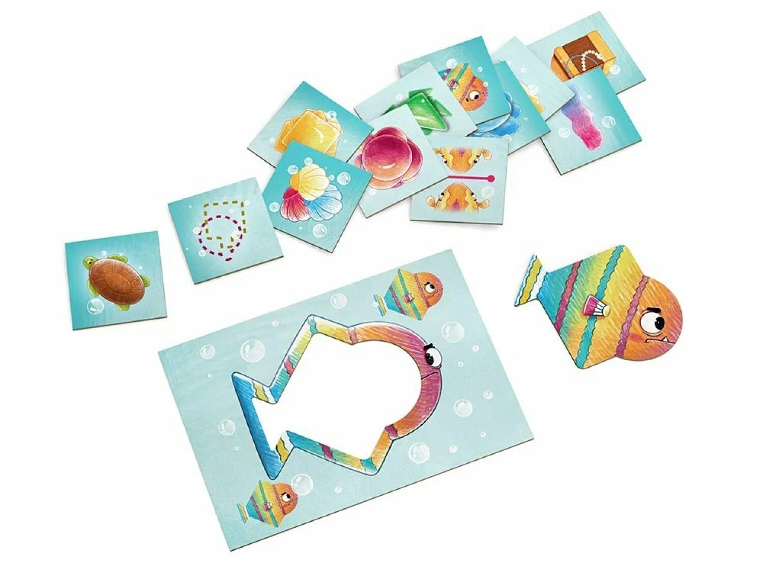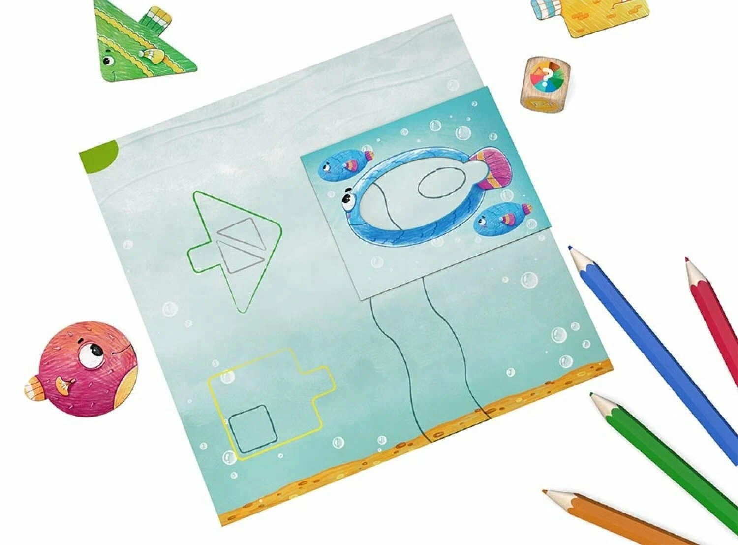 Игровой процесс проходит в раундах. Игроки по очереди бросают кубик и выбирают трафарет соответствующей формы (круг, квадрат, треугольник и т.д.). Обводят контур на поле, размещают рыбку в одной из зон аквариума и тянут жетон условия: «Покормите червями», «Спрячьте за водорослями» или «Добавьте пузырьки». Выполнение задания даёт второе очко и развивает внимание к деталям. Партия продолжается, пока поля не заполнятся или кубик не покажет «стоп».