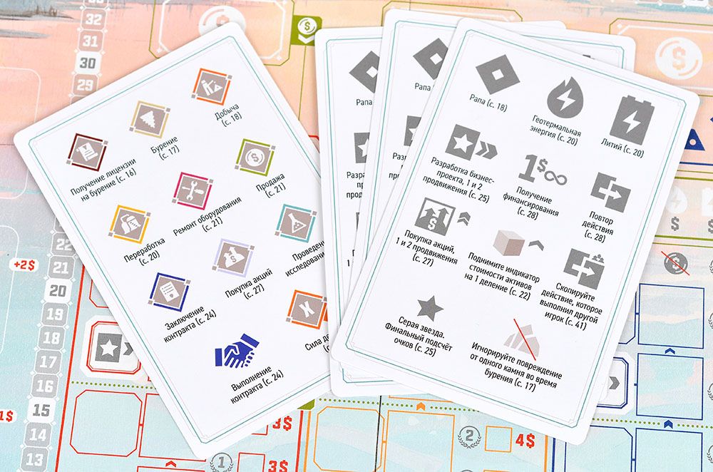 Каждый игрок управляет собственной компанией с индивидуальным планшетом. На планшете отмечены основные действия и инфраструктура: лицензии на участки, скважины, линии переработки, склады и техника. В свой ход игрок ставит рабочего на выбранное действие (или использует соответствующую карту), чтобы: