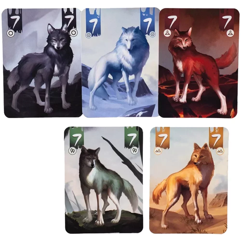 В центре стола лежит узкое поле, разделённое на пять вертикальных территорий: пещера, вулкан, пустыня, болото и тундра, каждая со своим цветом. Эти территории одновременно выступают и мастями карт, и «лейнами» для борьбы. В колоде 30 карт волков – по одной карте значений 2–7 в каждой из пяти мастей. В начале партии каждый игрок получает по 13 карт, а 4 карты остаются неизвестными, создавая лёгкую неопределённость в подсчётах.