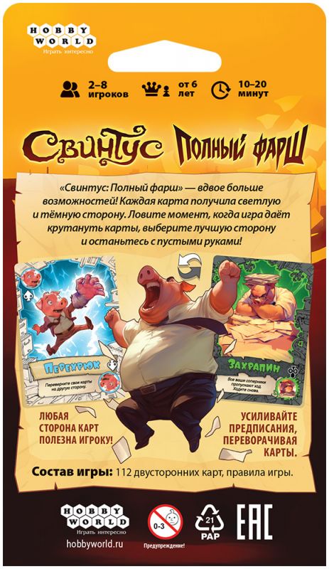 «Свинтус: Полный фарш» – обновлённая версия классического «Свинтуса», в которой каждая карта получила сразу две жизни: светлую и тёмную сторону. Игра сохраняет знакомую цель – первым избавиться от всех карт на руке, но добавляет новый тактический уровень благодаря возможности в любой момент «перевернуть» расклад буквально одним движением.
