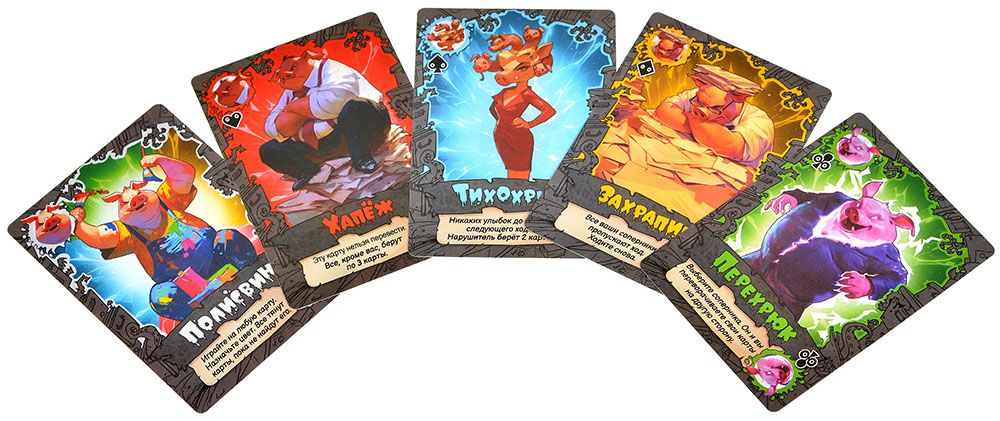Специальные карты (например, «Перехрюк», «Полисвин», «Тихохрюн» и др.) добавляют особые условия: переворот рук, смену цвета, ограничения на разговоры за столом и дополнительные штрафы за ошибки.
