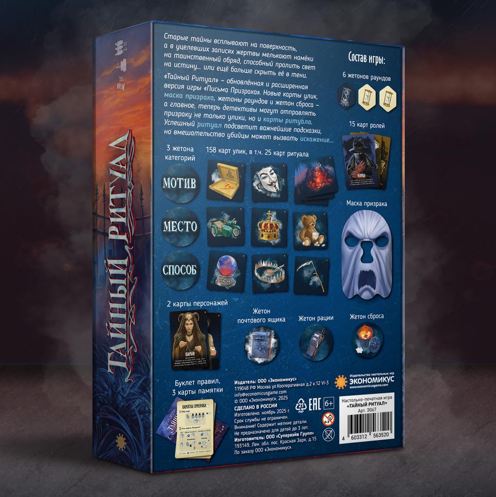 «Тайный Ритуал» – атмосферная настольная игра‑детектив, в которой игроки расследуют загадочное убийство, получая подсказки от молчаливого Призрака жертвы. Это обновлённая и расширенная версия хита «Письма Призрака»: добавлены новые карты улик, маска Призрака, жетоны раундов и сброса, а главное – особые карты Ритуала, меняющие ход расследования.