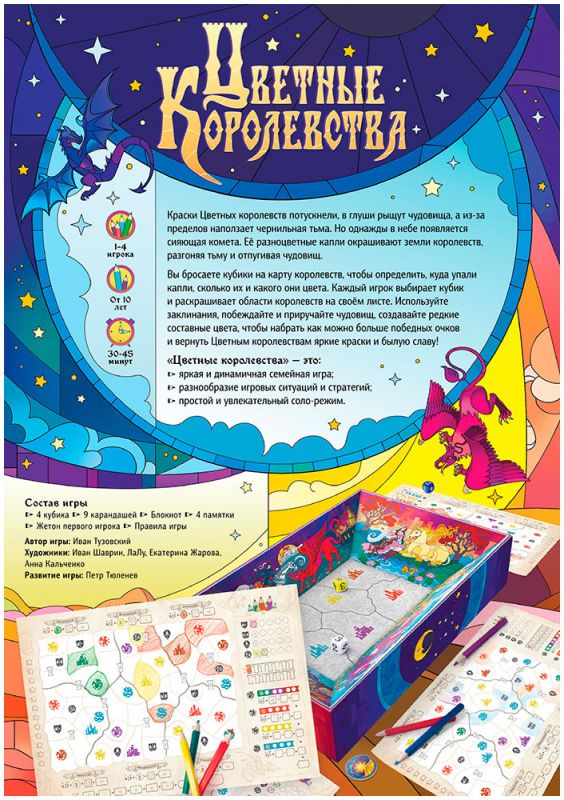 «Цветные королевства» рассчитаны на 1–4 игроков старше 10 лет, а партия обычно занимает 30–45 минут. Благодаря простым базовым правилам, ярким компонентам и возможности играть соло эта игра подойдёт и для семейных вечеров, и для спокойных партий вдвоём, и для тех, кто любит раскладывать настолки в одиночку.