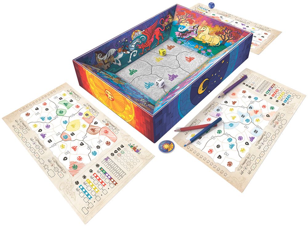На листах игроков изображены несколько королевств с различными зонами, чудовищами, столицами, башнями и особыми ячейками. Закрашивая области базовыми цветами – красным, жёлтым и синим, – вы не только зарабатываете победные очки, но и получаете доступ к заклинаниям, бонусам и взаимодействиям с чудовищами. В особых местах, например у сторожевых башен, можно смешивать базовые цвета и создавать составные – фиолетовый, зелёный и коричневый – которые открывают ещё более выгодные комбинации и приносят дополнительные очки.​
