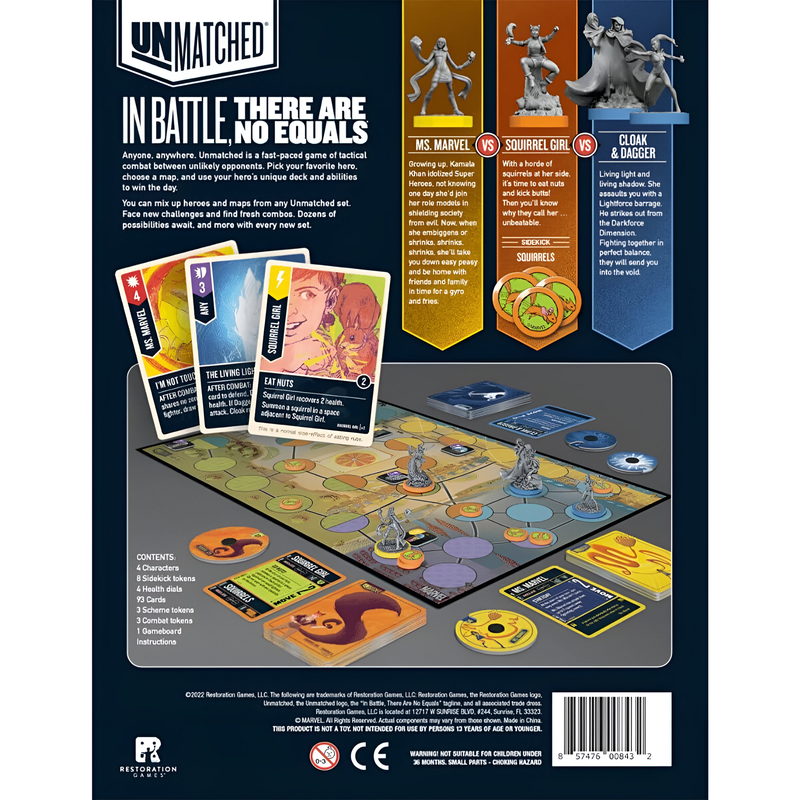 Unmatched: Teen Spirit – автономный набор в серии тактических файтингов Unmatched, посвящённый молодым героям вселенной Marvel. В коробке вы найдёте три боевых «слота»: сольный герой Мисс Марвел, сольный герой Белка‑девочка и дуэт Плаща с Кинжалом, управляемый как одна команда. Как и в других наборах Unmatched, каждый персонаж использует свою колоду, миниатюру и особые правила, а сражения проходят на отдельной карте – здесь это Navy Pier, пирс с несколькими зонами и набором предметных токенов, влияющих на бой.