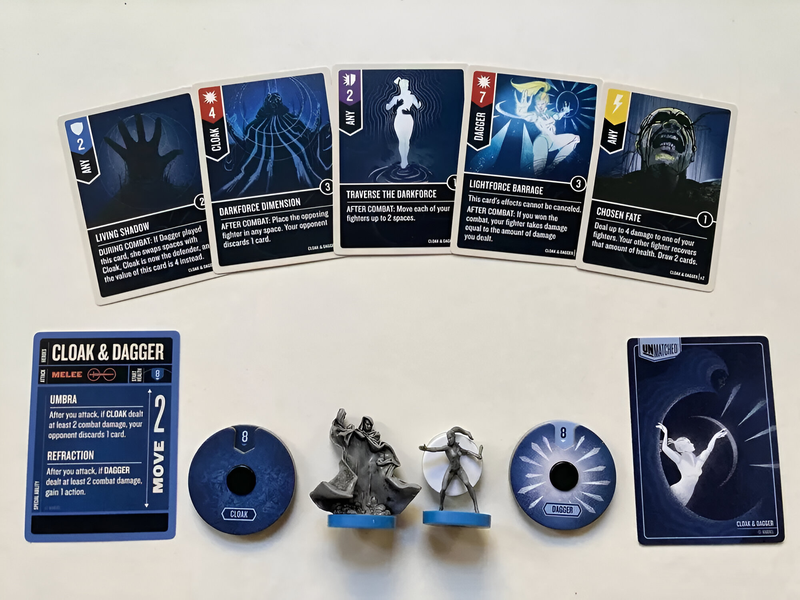 Плащ и Кинжал – дуэт, который действует как единый герой, но с двумя миниатюрами на поле. Их колода подчёркивает синергию: многие эффекты срабатывают сильнее, если оба персонажа правильно расположены относительно противника или друг друга. Плащ отвечает за контроль пространства и перемещение – включая телепортацию врагов, – а Кинжал наносит быстрые и точные удары. В паре они становятся очень гибкой и мобильной угрозой, способной вырывать инициативу в неожиданные моменты.