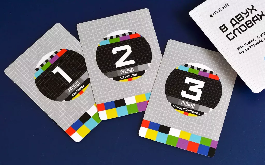 • Карты раундов (3 шт.) – отдельные карты, обозначающие текущую категорию (фильмы, сериалы, мультфильмы) и порядок раундов.​
