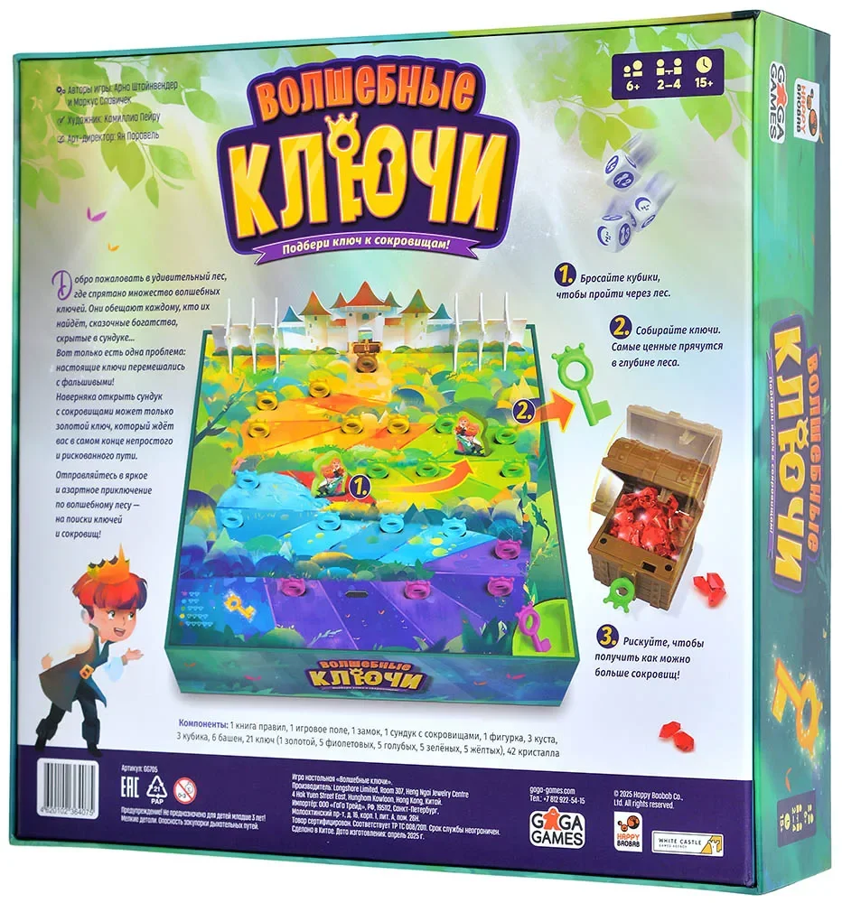 «Волшебные ключи» (Magic Keys) — яркая семейная игра‑бродилка, в которой игроки отправляются по тропинкам Волшебного леса на поиски ключей от сундука с сокровищами. Это простая по правилам, но очень эмоциональная настолка с объёмным полем, настоящим сундуком и россыпью пластиковых кристаллов, отмеченная несколькими крупнейшими международными премиями как одна из лучших детских игр последних лет.