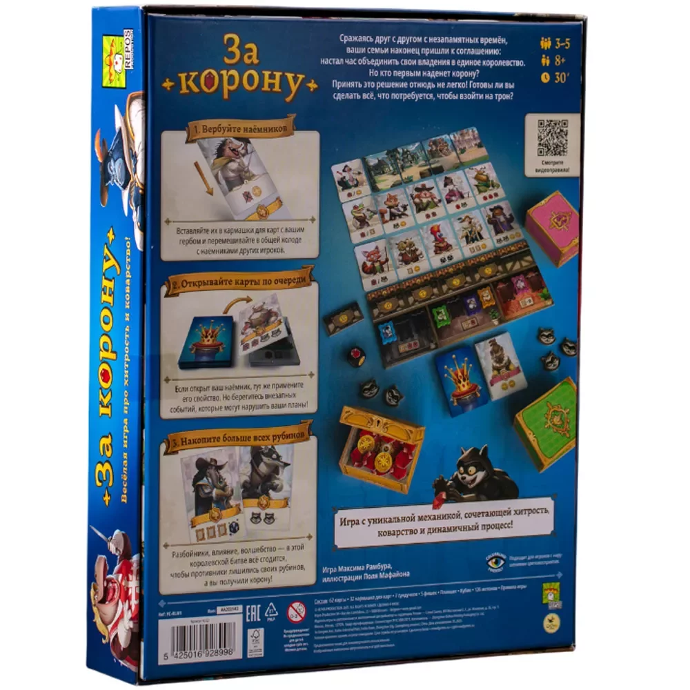 «За корону» – быстрая и эмоциональная настольная игра, в которой вы возглавляете знатный дом и пытаетесь любой ценой занять трон королевства. Интриги, хитрые сделки и неожиданные события здесь важнее прямого силового давления: победу приносит умелое управление наёмниками, своевременные удары по оппонентам и аккуратное обращение с фамильными богатствами. Игра рассчитана на 3–5 участников и отлично подходит как для семейного вечера, так и для шумной компании друзей, любящей «подколоть» друг друга за столом.