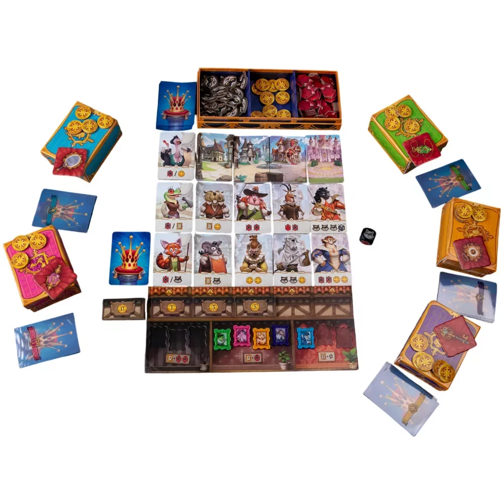 Компоненты игры подчёркивают атмосферу придворных интриг: у каждого есть эффектный личный сундучок, куда складываются рубины и реликвия, а протекторы встроены прямо в игровой процесс и не требуют отдельной покупки. При всей необычности механики правила остаются простыми и интуитивными: вербуй, складывай карты в кармашки, перемешивай общую колоду и смотри, как по одной разыгрываются последствия твоих решений. В финале четвёртого раунда игроки подсчитывают рубины, и тот, кто накопил больше всех, надевает корону и становится новым правителем.