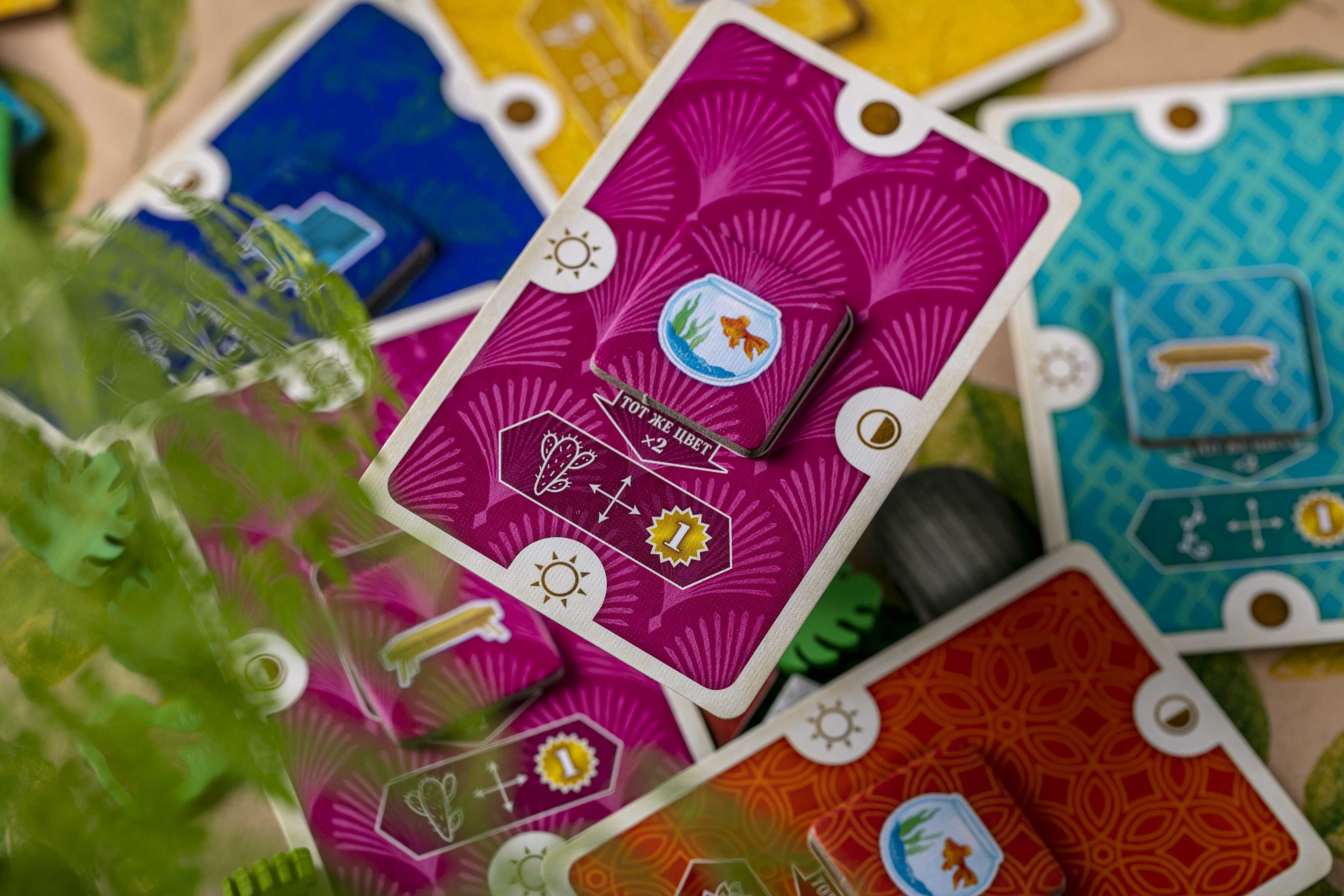 Помимо света, важна и атмосфера интерьера. Жетоны обстановки и питомцев дают очки за цветовые сочетания и разнообразие. Если цвет мебели совпадает с цветом комнаты, вы получаете дополнительные бонусы, а питомцы могут давать особые условные очки за соседство с определёнными растениями или типами комнат. Жетоны горшков позволяют пересаживать растения в более «крутые» ёмкости – это повышает их ценность в конце игры.