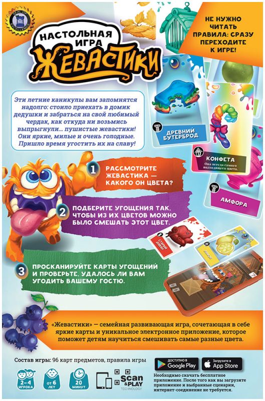 Главная задача игроков – накормить эту компанию существ идеальными угощениями, подбирая карты так, чтобы при смешении их цветов получить оттенок, максимально похожий на цвет шерстки очередного гостя. Для этого используется уникальное бесплатное приложение: оно сканирует карты предметов и «замешивает» цвета, показывая, довольны ли жевастики своим обедом.
