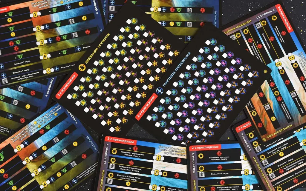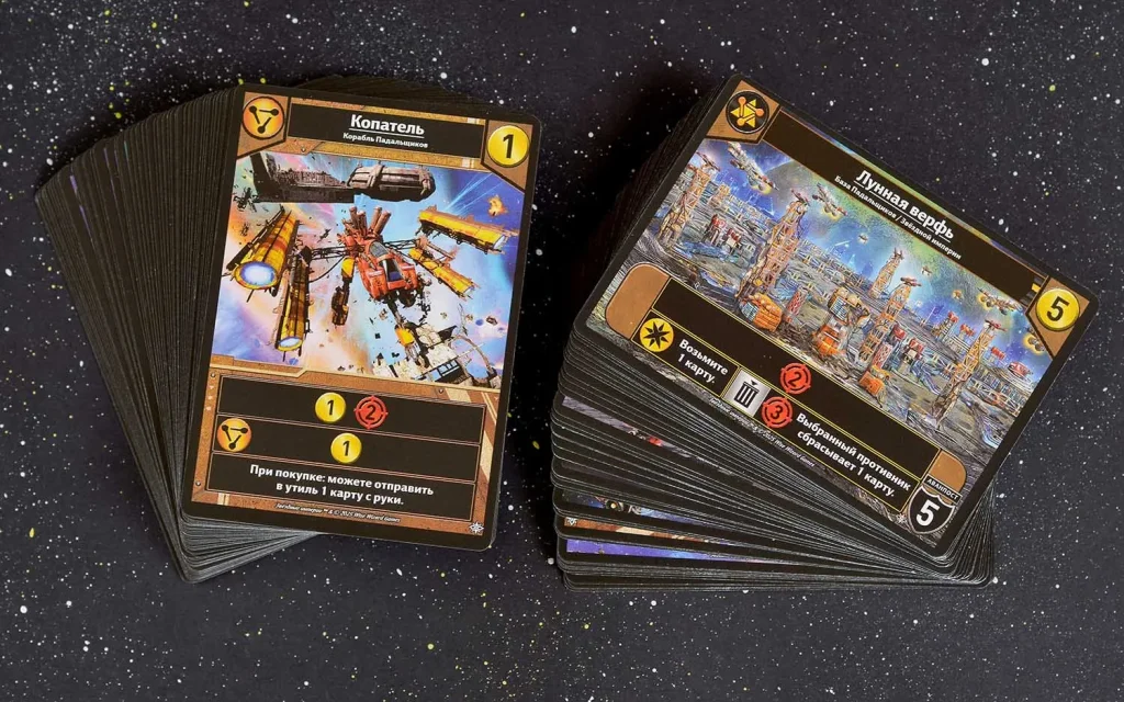 Для любителей классических «Звёздных империй» набор перезагрузки предлагает ещё один интересный вариант использования. Если взять стартовые колоды игроков и исследователей из любой базовой коробки «Звёздных империй» и совместить их с торговой колодой из набора перезагрузки, вы получите новую полноценную конфигурацию для обычных дуэлей по стандартным правилам. Торговая колода здесь сформирована из карт, «родных» для эпохи «Наследия»: она даёт свежие тактические сочетания и ощущается заметно иначе, чем классический набор, сохраняя при этом узнаваемый дух космического deck‑building.