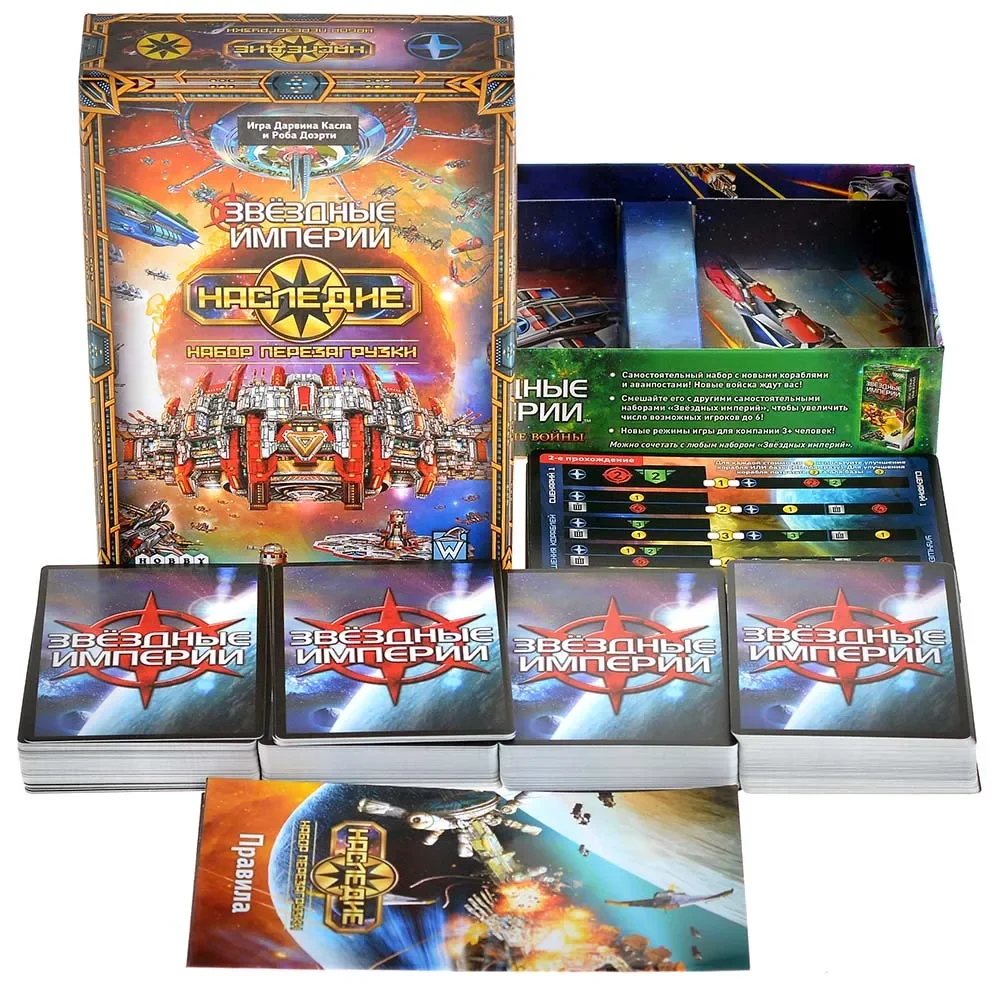 «Звёздные империи: Наследие. Набор перезагрузки» – дополнение к кампанийной версии «Звёздных империй», которое позволяет снова пройти всю историю и сохранить при этом карты в аккуратном виде, не используя наклеек. Если базовая коробка «Наследия» уже сыграна, сюжетные карты помечены стикерами и часть решений сделана, набор перезагрузки даёт шанс отмотать войну между Торговой Федерацией и Звёздной Империей назад и прожить её по‑новому.